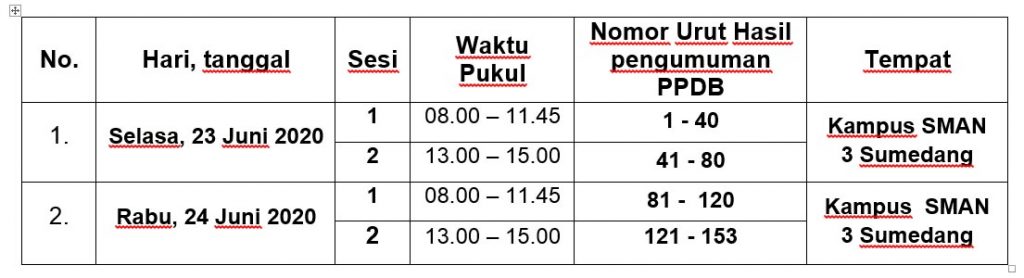 - Peserta Didik Baru melakukan registrasi ke kampus SMAN 3 Sumedang setelah semua persyaratan lengkap .